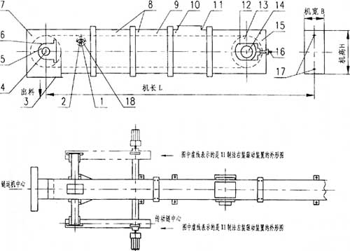 9、輸送鏈 10、中間節(jié)(非標(biāo)) 11、進(jìn)料口 12、尾軸承箱 13、尾輪 14、尾軸 15、尾部