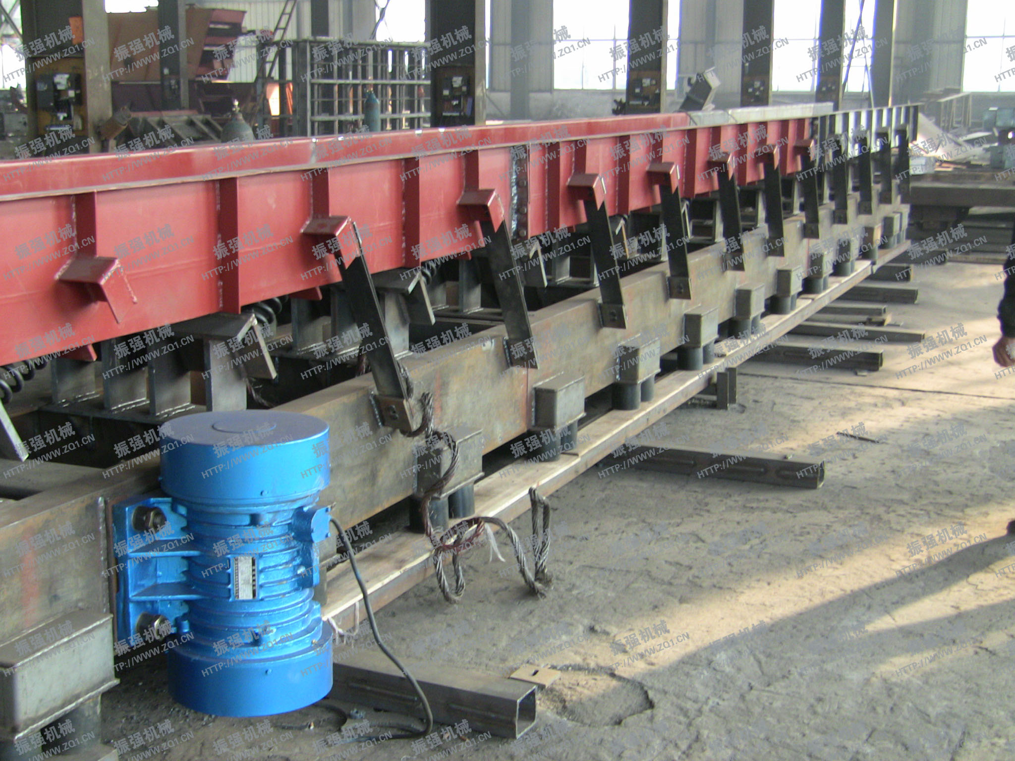 - SZF型慣性振動輸送機(jī)采用兩臺振動電機(jī)作為激振動源,運(yùn)用自同步原理,兩臺振動電機(jī)反向轉(zhuǎn)動,使輸送機(jī)底部平衡架產(chǎn)生往復(fù)振動,經(jīng)過主振簧與導(dǎo)向板簧的作用,帶動上部輸送槽振動,從而達(dá)到輸送物料的目的。該機(jī)是一種通用輸送機(jī)械,除用于水泥行業(yè)外,還可用于冶金、礦山、化工、電力等行業(yè),是一種理想的新型輸送設(shè)備。